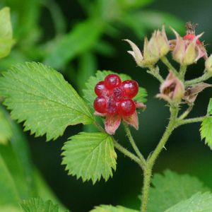 ナワシロイチゴ 苗代苺 2/2 実を 待ってる間に 忘れちゃってて… あっーーー! 思い出して 慌てて 見に行ってら ほんのちょっと 残ってました。 またもや ギリギリ セーフ ちっちゃな ツブツブが集まった 集合果です。 この写真の 実は 小ぶりでしたが 形も整って いいサイズだと 1.5cm位だそうです。 食べられるって 予習済み。 いただきまーす。 パクッ 甘さは? 酸っぱいな。 ジャムなどにすると 美味しいらしいです。そうだろうなぁ~って感じでした。 撮影 2020 7/12