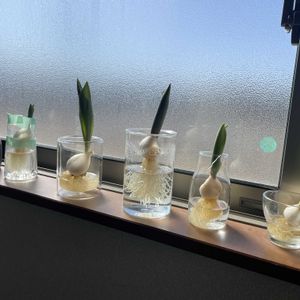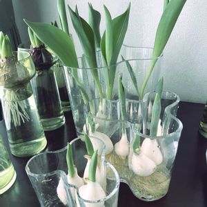チューリップ水耕栽培🌷 10月から冷蔵庫で春化処理した球根を、1月中旬にセット。 最初は3枚目の平たい花器にまとめていましたが、 芽が伸びる速さにばらつきが出てきて、花器を変えています。