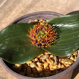 ダウベニア・ゼイヘリが咲きました✨♬。よく見ると花の中心が紫色になってます。 マッソニアとよく似たお姿👯♂️ですが区別点はどこなのかは分かんないです😆。