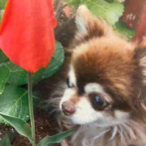 今日のお花 チューリップ 真っ赤なチューリップ🌷と愛犬🐕 アイコンにも使ってるくらい 過去picの中でも大好きな1枚❤️