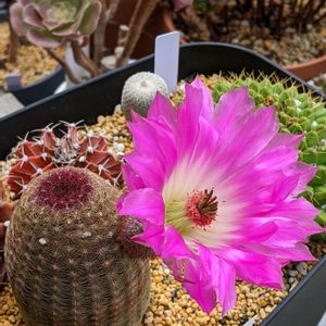 サボテンの花が咲きました。 トゲトゲの姿からは想像できない、可憐な花🩷 サボテン🌵苦手だったけど、好きになりました😊😆 と,いうわけで、2枚目 サボテン紫太陽を中心に寄せ植えしました🌵🩷😊