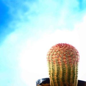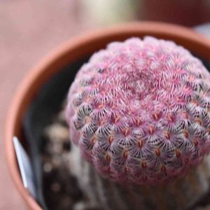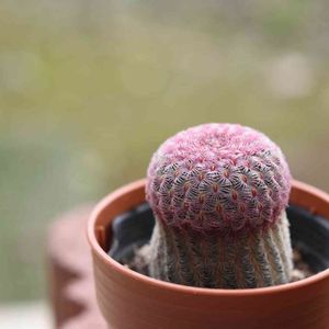 サボテン・紫太陽。もう一株あって大きい方には花が咲いたが、こちらはまだ花を咲かせない。 変化がないようでいて、以前の写真と比べると、先端が丸く膨らみ、棘の赤みも増えてきた。