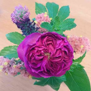 上から撮ってみた♡ いつもの青山フラワーのキッチンブーケ よく見たらこの間買ったバラ✖️トリフォリウムの色違い
