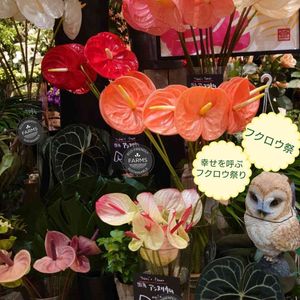 7/29㈮① アンスリウム 青山フラワマーケットさんの様々なアンスリウムたち 右下の大きな緑色の葉もアンスリウムでアンスリウム クラリネルビウムという品種です。仏炎苞ではなく、細長い茎の先に細い緑の花を咲かせます。 今日は29日 🏷フクロウ祭 🏷幸せを呼ぶフクロウ祭り 皆さんにも福がありますように🤗🍀🍀🍀🍀🍀
