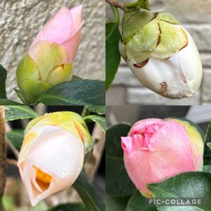 💗椿 🤍『千羽鶴』💗 待ちに待った今年初の蕾🎵 先週の土曜日3/18に蕾の先にピンク色が顔を出し始めました😍 1番下が3/22です😊