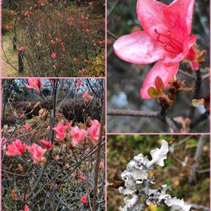 雪のようにツツジの枝を覆うウメノキゴケ。 ツツジ園の一角、 灰青に紅葉と季節外れの花も混じり 幻想的な雰囲気を作っていました。