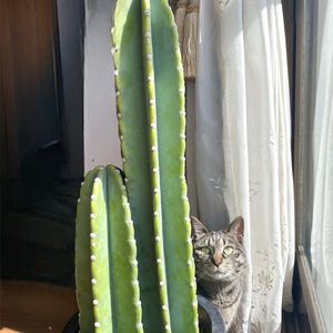 本日2投目、失礼いたします🙏 今日のお花がサボテンということで 昨年ふるさと納税で我が家へお迎えしていた柱サボテン🌵 夏にはお花が咲いたのですが、投稿しそびれ💦今年は夏バテしていても記念撮影するから、また咲いてくださいませ🙏 大きさは横にオスマシで座っているキキちゃんから類推ください😸🌵
