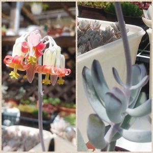 こんにちは☁☁☁ 今日の天気もイマイチ💦 パッとしない天気だなぁ😓 多肉棚の一番上に置いてた寄せ植え🍀 福娘に可愛い~可愛い~花がぶら下がっていたょ🌸(^^♪ 多肉棚の奥って💦 日の当たらないのもあるから、チョイチョイ前後の入れ替えしないと😓 徒長するのも出て来るょ~😫