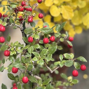 鉢物 🍁紅葉🍁 🔴🔶🔴🔶🔴 手前の赤はサンザシ 美味しいそうな彩り❤️になりました 乾燥すると 薬膳食材ノ山査子に🤓 盆栽仲間から👴が譲り受けましたー バトンを渡され、、、、 来年も沢山の実が見れます様に💪