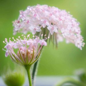 ブルーレースフラワーのピンク花です。 満開の時はもちろん、 咲きはじめの つぼみが入った編みカゴみたいな姿も とても愛らしいのです。