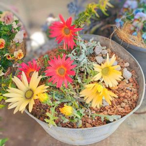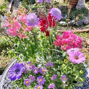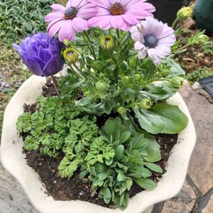 薄曇空の少し寒い午後です 先日買った花苗 やっと寄せ植えしました オステオスペルマム 八重咲きアネモネ こぼれ種からの忘れな草 満開が楽しみです。