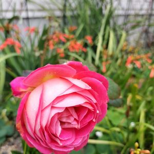 雨の日曜日です☔ 1輪だけ咲いている薔薇 🌹希望🌹 植えてから5年 沢山の花が咲き好きな薔薇なのに 昨年カミキリ虫にタマゴを産みつけられて 細い枝1本だけになりました(。•́︿•̀。) それでも大輪の花が咲きホットしました🌹