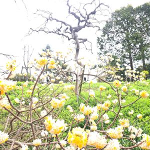 見事な枝ぶりの シダレエンジユの前に 今日のお花 黄色がまぶしかったです
