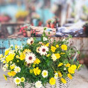 春らしく〜寄せ植え 購入のとき蕾みだった 小さな花💛クリサンセマム☆ムルチコーレ長い〜事咲いています♪ .。*♡.。*♡❀✾