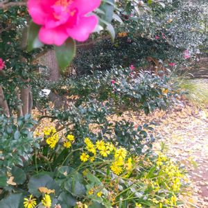 一輪咲き始めた椿の足元に 元気な今日の花① 黄色の絨毯に花模様のようです② 今週も宜しくお願いします♪