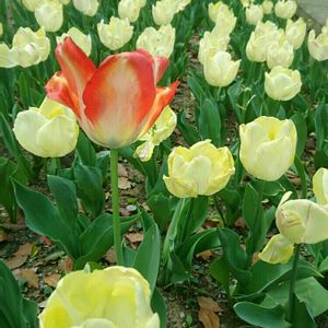 あれ🎵 迷子さんかな💛 チューリップ🌷🌷✨ レモンイエローの中に1本 なんか可愛い💕迷子ちゃん💛 日曜日 少しのんびり🎵自粛です😅😅💦