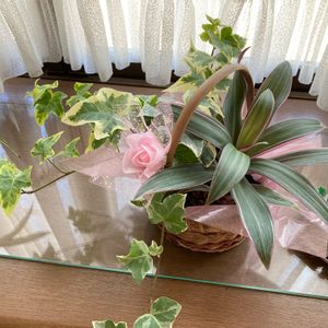 可愛い観葉植物の花籠💕2つの名前を教えてください。よく見かけるんだけど…。右側は、葉っぱの裏は全面ピンクっぽい赤紫色! ピンクの薔薇だけ柔らかいフェイクフラワー(造花)
