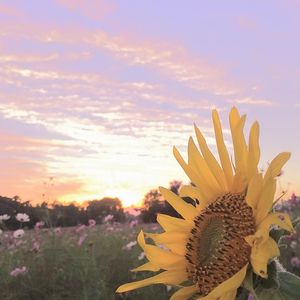 今日もお疲れ様でした~。 ヒマワリとコスモスが夕日に照らされています。