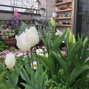 今日のお花 チューリップ🌷② 配置換えして真ん中にお花集めてます🌼🌸 ベランダドロドロ〜💦 デッキブラシでゴシゴシしないとね😅