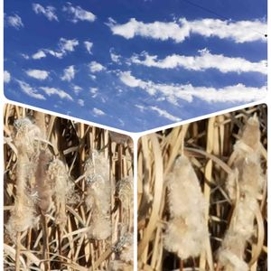 ガマの穂定点観測地にて 久々に通りかかったら 全て爆発のモフモフになってました💦 そのまま固まってこびりついてるので、触っても飛んでいかないの。 半分残ってたソーセージに爪を立てたらモクモク出てきて、ブワッと風に乗って飛んでった💦 この河原、1/5位刈り取られて平にならされ、どんど焼きの用意がされてました。
