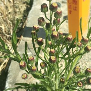 💠アレチノギク キク科 ムカシヨモギ属 青緑色の葉、非常に狭く起状のある葉、および紫の先端をした渦巻状の苞葉があり、その頂点の近くに長い毛を含む硬い毛で覆われています。頭花には白色小花と黄色い小花が咲くそうです