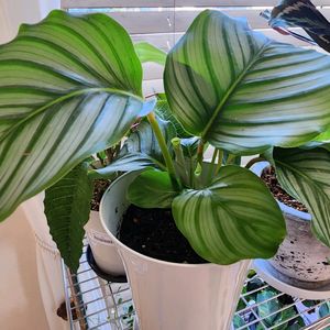 カラテアオルビフォリアの1年後。 昨年2月にお迎えして1年が経ちました。 3.5号から5号鉢になり、もう片手で持つのは限界。 スクスク育ったお気に入りのオルビちゃん♡ でもこれ以上は大きくならずに今のままが良いかな☺️