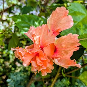 おはようございます🌿 今日のお花さん🌸 ハイビスカス🌺 フラミンゴオレンジ 可愛いく7輪咲いてくれました 🌺🌺🌺🌺🌺🌺🌺 2度冬越しした子です💕 根っこがパンパン💦 先にしかお花咲いてません😅 今日も素敵な休日を お過ごし下さい🍀