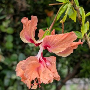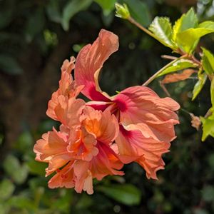 ハイビスカス・フラミンゴ(Hibiscus flamingo)の花🦩🌿🌼 フラミンゴは、オレンジ色の二段咲きで可愛らしいハイビスカスです。 🦩 フラミンゴをイメージさせるオレンジ色の花が垂れ下がるように咲くハイビスカスが「フラミンゴ」で す。 🌼🦩🌺