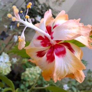 ハイビスカス🌺 フラミンゴ🦩 二段咲きのちょっと変わった形のハイビスカス🦩 シベが長いな~😉👍️✨ 今月もよろしくお願いします🙇⤵️