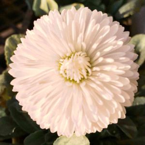 🤍🤍チロリアンデージーの八重のポンポンになる途中?🌼 真ん中の黄色い花芯から花びらが出ています👀🤍💕
