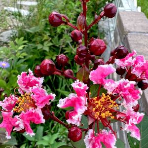 サルスベリの赤花が欲しくて迎えた2種のうちの 1つが咲き始めました♡٩(๑•ᴗ•๑)۶ 蕾は赤くて期待していたのに 咲いたら濃いピンク〜💕 この色なら近所の街路樹と同じだわ💦 ど〜しましょう(。-`ω-ก)ウーン