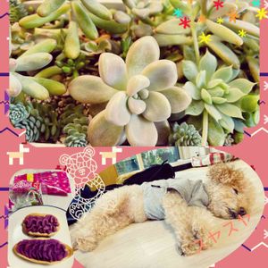 こんにちは😃 朝から土砂降りで冷たい☔️です。 🪴寄せ植えのぷくぷく だるま秋麗が可愛い❤️ 🐶メイ。 もしゃもしゃで 寝てるとぬいぐるみ🧸みたい。 近々顔まわりだけカット✂️してきます。 🍭大好きな沖縄の紅芋タルト 元祖 お菓子御殿のが人気だけど、 他のお店のも食べ比べ、 結果、どっちも美味しい‼︎😍