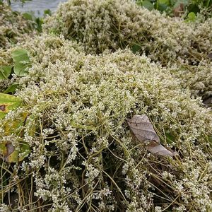 ◇最後に追記アリ◇ 相方が河川敷散歩で見つけて 送りつけて来ました 何でしょうか? 自分には漁業で使う網に見えない事もないですが お花的な物体も見えない事もないというか 両者の共存共栄? 場合によっては すぐ消したいと思います ホントに不法投棄の 単なるゴミかもしれませんので ⬇️ さっそく barchetta さんにアドバイス頂きました‼️ ネナシカズラ属の一味のようです❣️ ありがとうございます🌟 こんな不思議な植物がいるとは コーフンして検索のたびから戻れませんので ごきげんよう💞➰⤴️💨 ◇以下脳内整理の為の検索引用メモ◇ アメリカネナシカズラ 科名 ヒルガオ科ネナシカズラ属 1年草 学名 Cuscuta pentagona 別名 オオバナアメリカネナシカズラ 原産 北アメリカ 草丈 50cm 花期 8月~10月 特徴 他の植物に吸盤で絡み付いて成長するつる植物 寄生植物であり、葉緑素を持たない。 葉も退化している 環境 畑地、牧草地,荒地 、河川敷、海浜など ◇wiki 日本では1970年頃に東京都府中市の多摩川付近で初めて確認された 現在では北海道から九州までの全国に定着が拡大している 輸入穀物や緑化用の植物種子に混じって非意図的に導入されたものと考えられる ジャガイモやナスなどのさまざまな農作物や園芸植物に寄生し、生育を阻害する 外来生物法により 要注意外来生物に指定されている ◆ 在来のハマネナシカズラ、 またはクシロネナシカズラは 環境省レッドデータにある絶滅危惧種 ◇ ハマネナシカズラ 学名: Cuscuta chinensis 分類: 合弁花類 ヒルガオ科 登録別名: 環境省カテゴリ: 絶滅危惧Ⅱ類(VU) ◇別の記載 外来生物法に指定されているそうだ 1. ジャガウモ、茄子などに寄生して被害をだしているらしい 2. 穀物や砂防用植物の種子に混じって輸入されて帰化したらしい 花の特徴: アメリカネナシカズラ 花序が穂状にならず固まって付く ネナシカズラ 花序は総状に伸びて穂状になる 茎が太くて細紐状である