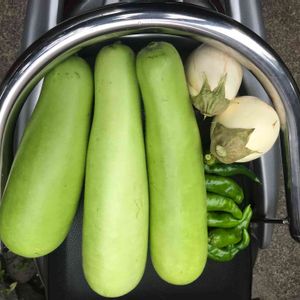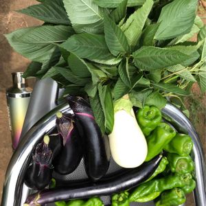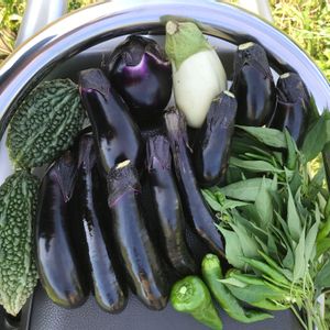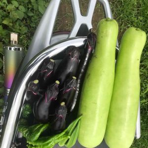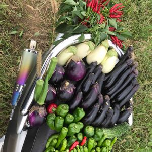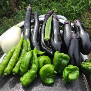 今日、収穫したお野菜達🍆🍅🥒😆 キュウリ、ニラ、シシトウ、こどもピーマン、ミョウガ、ミニトマト…そして小さな茄子(笑)✨ ん?🐶?