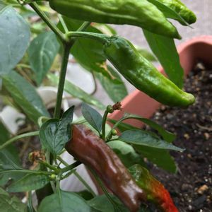 ししとう 種から77日目。しばらく白い花が咲き始めて毎日キャッキャッ喜んでましたが、よく見ると、実がアチコチでき始めていました😆 最初の果房は長さ3~4cmくらいで収穫した方が後々の収穫量が増えるそうです🤩