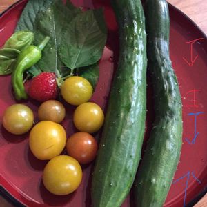 今朝の収穫分❣️季節外れのイチゴが紛れてます🍓♡ 昨夜の大雨で、一瞬の暑さで痩せかけた(赤部分)キュウリの太さが復活(青部分)🥒は水で出来ている。 しかし段々歪つになってきたのはさすがに蔓が疲れてきたせいかな?💧 愉しいけどなかなか難しい野菜づくり。 ミニトマトは数は成るもののタイミングが難しい😥。熟すまで放置すると落下したり身割れしたりするので、適当に切り上げてジックリ追熟するのが良いかも。身体に良くないミドリのトマチンが減るだけでなく、リコピンも倍増するようだし🍅。ヘタのとこは時間経過で黒くなっちゃうから今度はヘタごと採ることにしよう♬!