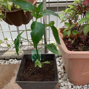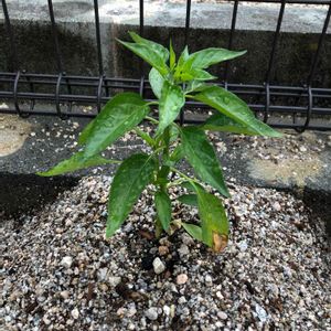 連休中に 夫が 庭の片隅に作った菜園もどき ししとう1株 甘長1株 ひもとうがらし2株🤗 ひもとうがらしは 初めての苗で どのようなのが できるか 楽しみ🙌🎶 ちゃんと 最後まで 世話をして下さい🙏