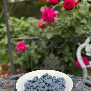 ハスカップ おっき目のを 収穫しました♪バラ🌹と一緒に パチリ📱 ①②③ハスカップ ④⑤グミ❤️❤️❤️ 🏷️真っ赤な火曜日に 参加させて頂きます🤗
