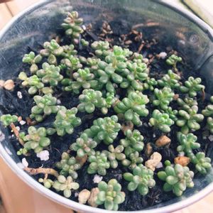 おはようございます😃続いてた雨が上がった隙にベランダへ🌟ポイポイバケツに入れてたセダムが根付いたみたいです。雨のお陰でぷりぷりしてる!