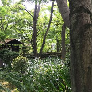 旧朝倉家住宅の庭門脇 シャガの盛り 新緑に囲まれて 🌿 北日本が雪景色とは ❄️😳