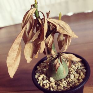 ダイソーの100円アデニウム 。 1年半前に双子で連れてきたものだけど、こちらは結構太ったねぇ♪ 今年の冬は枯れた葉っぱが落ちなかったけど 新芽が出てきたから綺麗にしました もう一つの株は寸胴で無事に育っているけど、枯れない葉っぱすらある…!