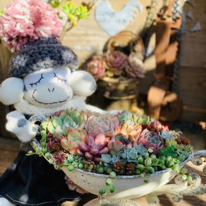 こんにちは(*'▽'*) 風が冷たいですね。 今日のpicは、regaloさんのソクモンちゃんとmayunoさんのリメ鉢に植えたクリームティです。 私好みの物ばかり😄💕 写真撮りながら、ニヤニヤしてしまいました~可愛くて😄💕 クリームティは、ビザールさんからお迎えしたものです。 明日の朝は、寒くなりそうだから夕方プチプチを多肉ちゃん達にかけてあげようと思います。😌