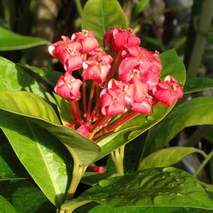 サンタンカ(山丹花)は 元々 熱帯アジアの原産ですが 沖縄には 古くに移入され 沖縄と九州の一部で野生化しています。 赤い花が一般的ですが ほかに白 ピンク オレンジ 黄色があります。 開花は5〜10月ですが 植物園の温室では 冬でも咲いています。 中国南部 マレー半島原産。 アカネ科サンタンカ属の常緑低木。