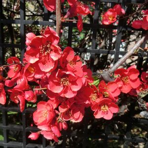 今日のお花 ボケ(木瓜)です。 花の後に実る楕円形の果実がウリ(瓜)に似ているので木になる瓜でモケとなり これが訛ってボケになったのだとか…。 中国から渡来し 日本で多数の園芸品種が作られ花色も 赤 ピンク 白 オレンジなど様々です。 中国・日本原産。 バラ科ボケ属の落葉低木。