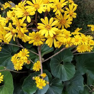 目にも鮮やかなツワブキの花です。 丸い葉っぱは 形がフキ(蕗)に似ていて 皮質で 艶があり 艶葉蕗(ツヤハブキ)が訛って ツワブキになったとか…。 東北以南の日本各地に自生していますが 島根県の津和野の地名は ツワブキが多く生える所 "つわぶき野"から転じて"津和野"になったと言われ 町の花も ツワブキです。 地下のワサビに似た根茎が横に連なり広がっていきます。 日本 朝鮮半島 中国東南部 台湾原産。 キク科ツワブキ属の多年草。