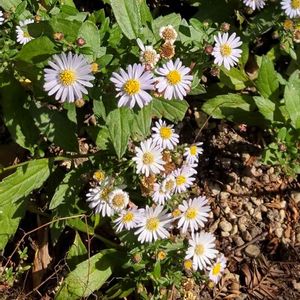 カリメリスはヨメナの仲間の園芸品種です。日本からヨーロッパへ持ち込まれ ジャパニーズ アスターの名前で広く親しまれています。 花の様子や花色が変化するため七変化の別名もあります。 咲き始めは中心部がクリーム色で花びらは白の一重咲きで やがて 白の八重咲きになり 秋になると薄紫の八重咲きに変わるとか…。 暑さにも寒さにもに強い宿根草です。 日本原産。 キク科ヨメナ属の宿根多年草。