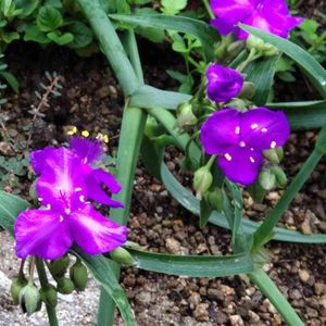 大きな3枚の花びらを広げて咲くこの花はムラサキツユクサ(紫露草)です。 雄蕊の花糸(葯を支える部分)はフワフワの毛が生えた髭状で 黄色い葯とのコントラストも鮮やかです。 ひとつ1つの花は朝咲きの1日花で よく晴れた暑い日には昼頃には萎んでしまいますが、雨や曇天の日には夕方頃まで咲いています。 種がよく実り こぼれ種でも増えていきます。 カナダ南部からアルゼンチン北部のアメリカ大陸原産。 ツユクサ科ムラサキツユクサ属の多年草。