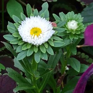 純白で中央部が黄色いアスターの園芸品種です。街散策の途中 公園で見付けました。 アスターは品種がとても多くて特定出来ませんが 総苞片(葉っぱが変化したもの)が発達しているのが特徴の品種です。 キク科エゾギク属の耐寒性1年草。 中国北部原産。