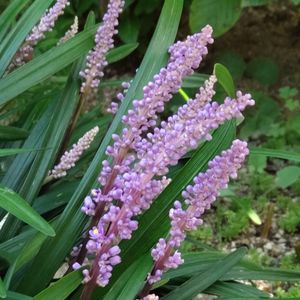 ヤブラン(藪蘭)が薄紫色の花を穂状に咲かせています。 とても涼しげで 濃い緑色の葉っぱが その鮮やかさを引き立てます。 日本・東アジア原産。 キジカクシ科ヤブラン属の常緑多年草