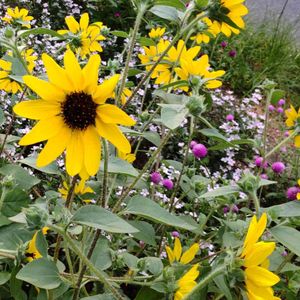 明るく鮮やかなビタミンカラーのヒマワリ(向日葵)は花壇を一層引き立てます。 これは草丈の低いコンパクトな矮性ヒマワリです。次々と花を咲かせ長い期間楽しめます。 ヒマワリは太陽が移動するに従って花の向きが変わると言う意味で日廻りと呼ばれていましたが、実際は花が咲いてからは東を向いたままのことが多いようです。 このヒマワリさん達はあっちこっち向いてますが…。💦 北アメリカ原産。 キク科ヒマワリ属の1年草。